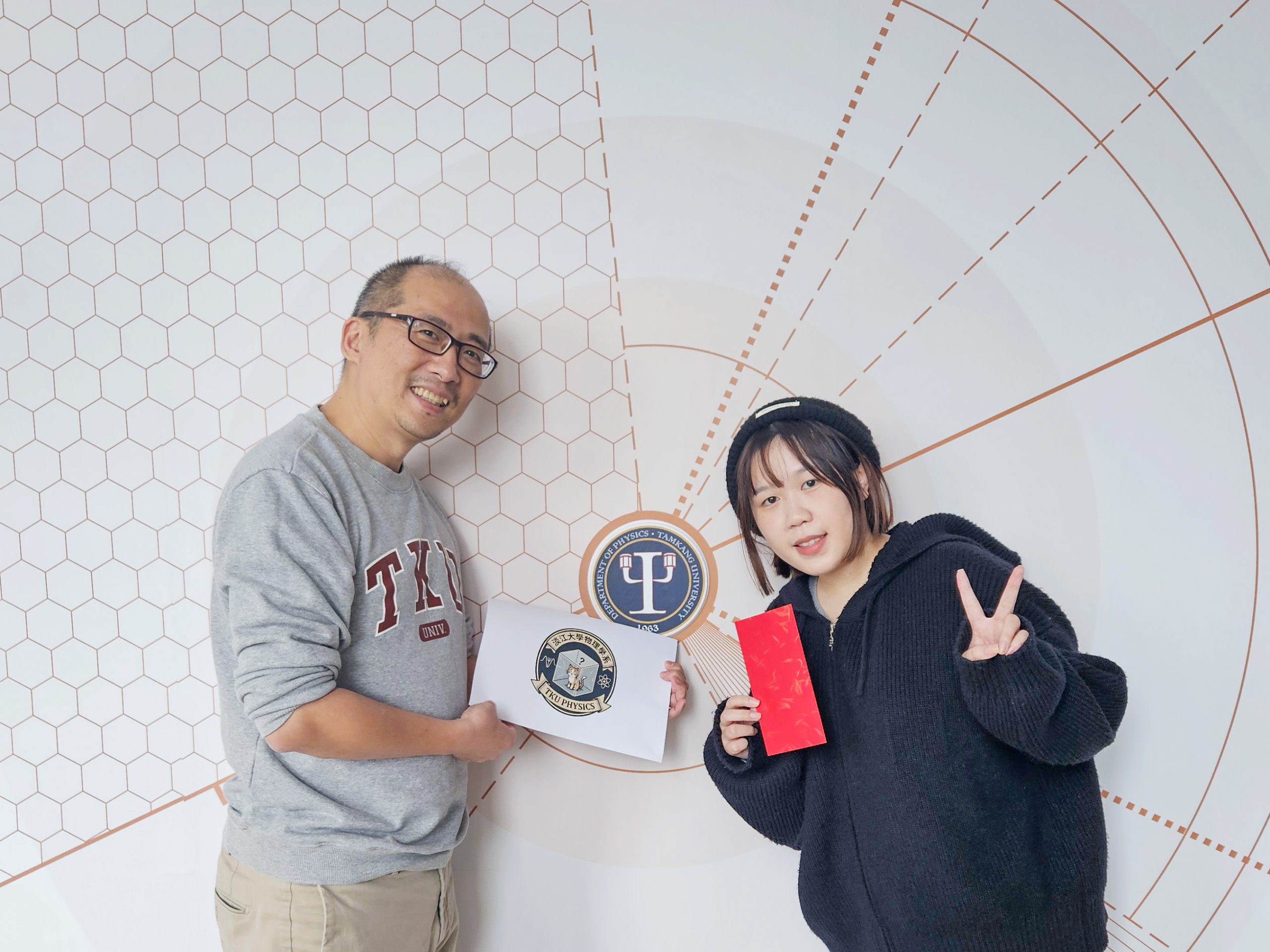 • 「淡江大學物理學系」與「TKU PHYSICS」: 清晰地標明了所屬機構,強化了學系的身份認同與榮譽感。