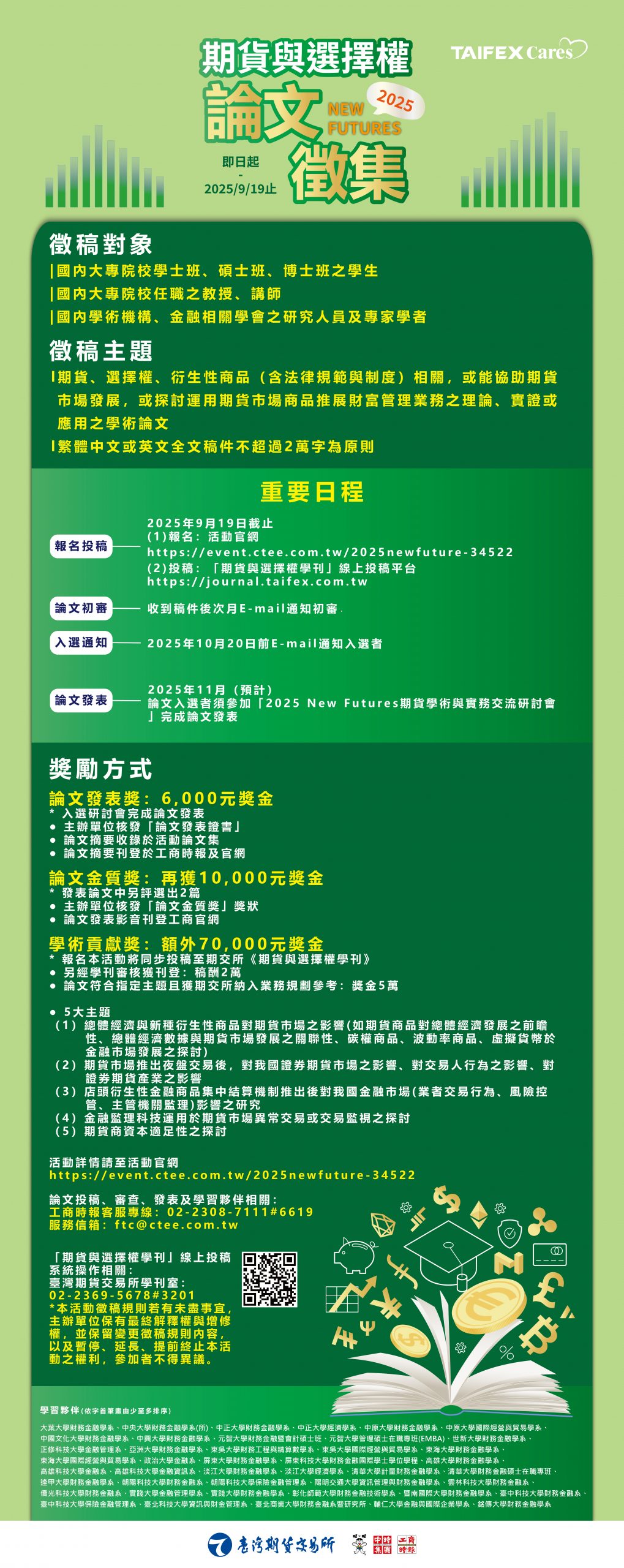 ★ 學術貢獻獎勵:若投稿論文主題為「我國期貨市場商品設計或業務推動相關」,並該研究獲期交所納入業務規劃參考,再致贈獎金5萬元!