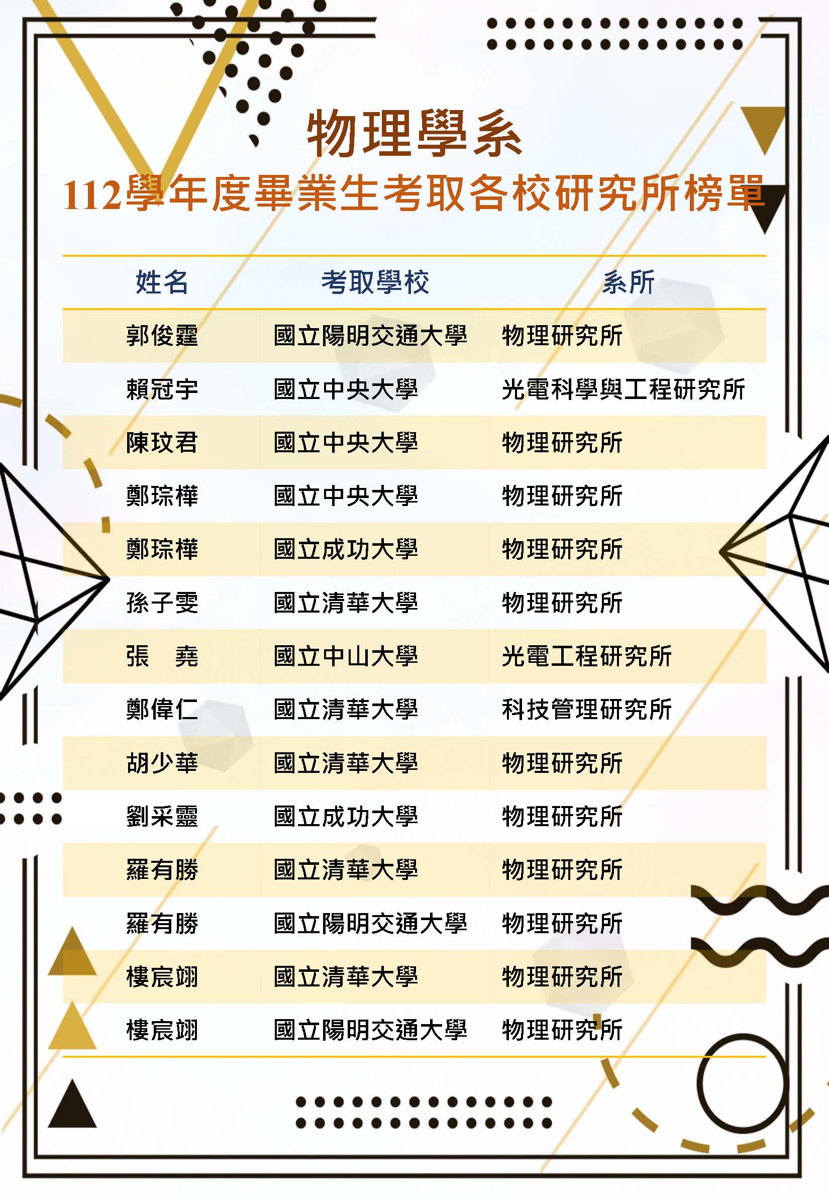 淡江物理畢業生考取研究所榜單