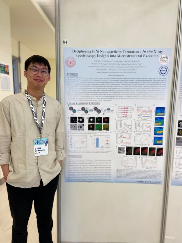 本次於2025國家同步輻射中心用戶年會參與壁報競賽,發表題目為Deciphering PtNi Nanoparticles Formation: In-Situ X-ray Spectroscopy Insights into Microstructural Evolution針對了 PtNi 奈米雙金屬顆粒 (PtNi-NP) 合成過程進行深入研究,此材料在氫氣生成反應(HER)中的結果顯示,它只需要 15.2 mV 的過電位就能達到高效率反應,展現極佳的催化性能。為了了解其形成過程中的電子與原子結構變化,我們利用臨場X光吸收光譜(XAS)、X光繞射(XRD)和掃描式X光顯微術(STXM)進行探究。隨著溫度加熱至 400 °C,鉑 (Pt) 的價態由 4+ 轉為金屬態,並由最初與氯 (Cl) 結合,逐漸轉為 Pt–Pt 與 Pt–Ni 的結構;而鎳 (Ni) 大致保持金屬態。特別是在 400 °C 附近,晶格結構出現明顯轉變,顯示相變發生。這些結果一致證明了 PtNi-NP 在形成過程中的結構轉換,進一步揭露催化劑形成的動態變化過程。
